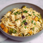 The Cranberry-Glazed Roasted Butternut Squash, Brussels Sprouts, and Sweet Potato Salad is a delightful fall dish that brings together the earthy flavors of roasted vegetables and the tartness of cranberries. Perfect for holiday gatherings or a cozy family dinner, this salad offers a beautiful balance of sweet and savory. With its vibrant colors and rich textures, it’s sure to impress your guests while being simple enough for a weeknight meal.